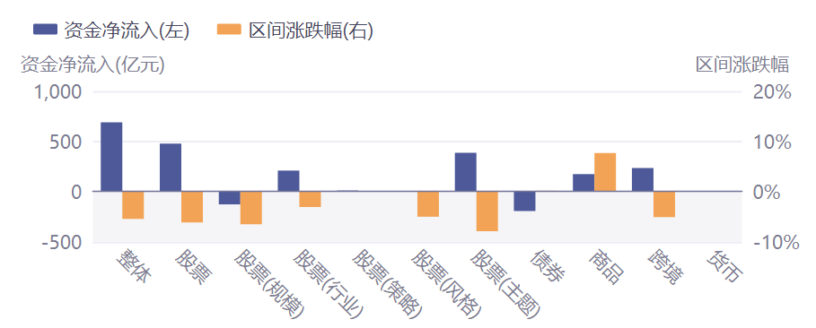 本期(2025年10月13日-10月16日),尽管市场高低切换下,高成长赛道资金有明显流出迹象,但总体而言,资金布局ETF市场的决心依旧未变,截至本周,资金连续6周资金大幅流入。本期资金净流入超千亿达688.86亿元,场内资金信心持续提振。随着第二批科创债的首日售罄,多只债券ETF迎来大资金流入,整体流入达766.04亿。股票型ETF逢低布局意愿强烈,流入超470亿,跨境型ETF、商品型ETF流入均超百亿。