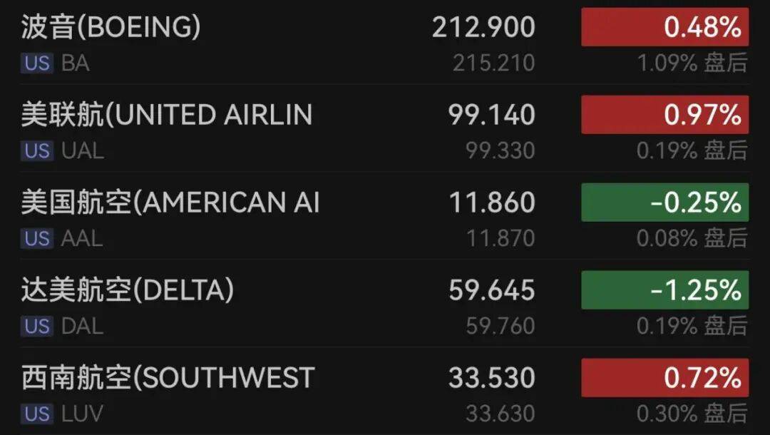 航空股涨跌不一,波音涨0.48%,美国航空跌0.25%,达美航空跌超1%,西南航空涨0.72%,美联航涨近1%