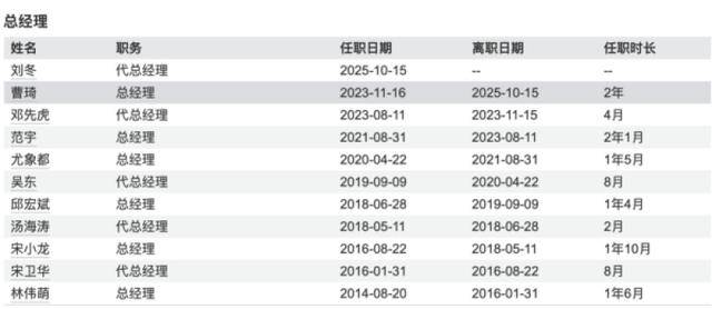 2019年9月吴东开始代理总经理,八个月后尤象都接任,任职约一年五个月。范宇自2021年8月起担任总经理近两年,之后邓先虎代理四个月,曹琦于2023年11月正式接任,任职约两年至2025年10月。如今,刘冬自2025年10月15日起担任代总经理。