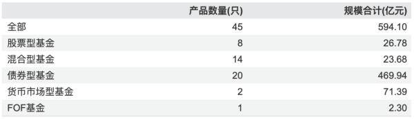 该公司的业务格局是典型的“重债轻股”。债券型基金独占鳌头,20只产品规模合计高达469.94亿元,占总规模的近80%。