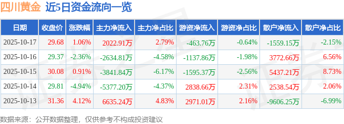 证券之星消息,截至2025年10月17日收盘,四川黄金(001337)报收于29.68元,上涨1.06%,换手率8.35%,成交量24.09万手,成交额7.26亿元。