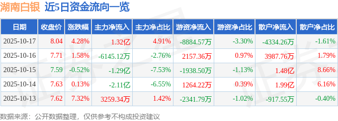 10月17日的资金流向数据方面,主力资金净流入1.32亿元,占总成交额4.91%,游资资金净流出8884.57万元,占总成交额3.3%,散户资金净流出4334.26万元,占总成交额1.61%。