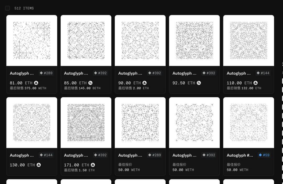 另外还有总量为512个的生成艺术系列Autoglyphs,地板价在80 ETH左右,算是大家公认的第一个链上生成艺术,人们心中的圣杯。目前总交易量有2.1万 ETH。