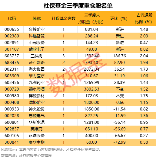 从持股比例看,社保基金持有比例最多的是三棵树,持股量占流通股比例为2.04%;其次是科远智慧,社保基金持股比例为2.03%,持股比例居前的还有萤石网络、祥源新材、海大集团等。