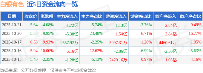 证券之星消息,截至2025年10月21日收盘,白银有色(601212)报收于5.64元,下跌4.08%,换手率7.07%,成交量523.61万手,成交额29.94亿元。
