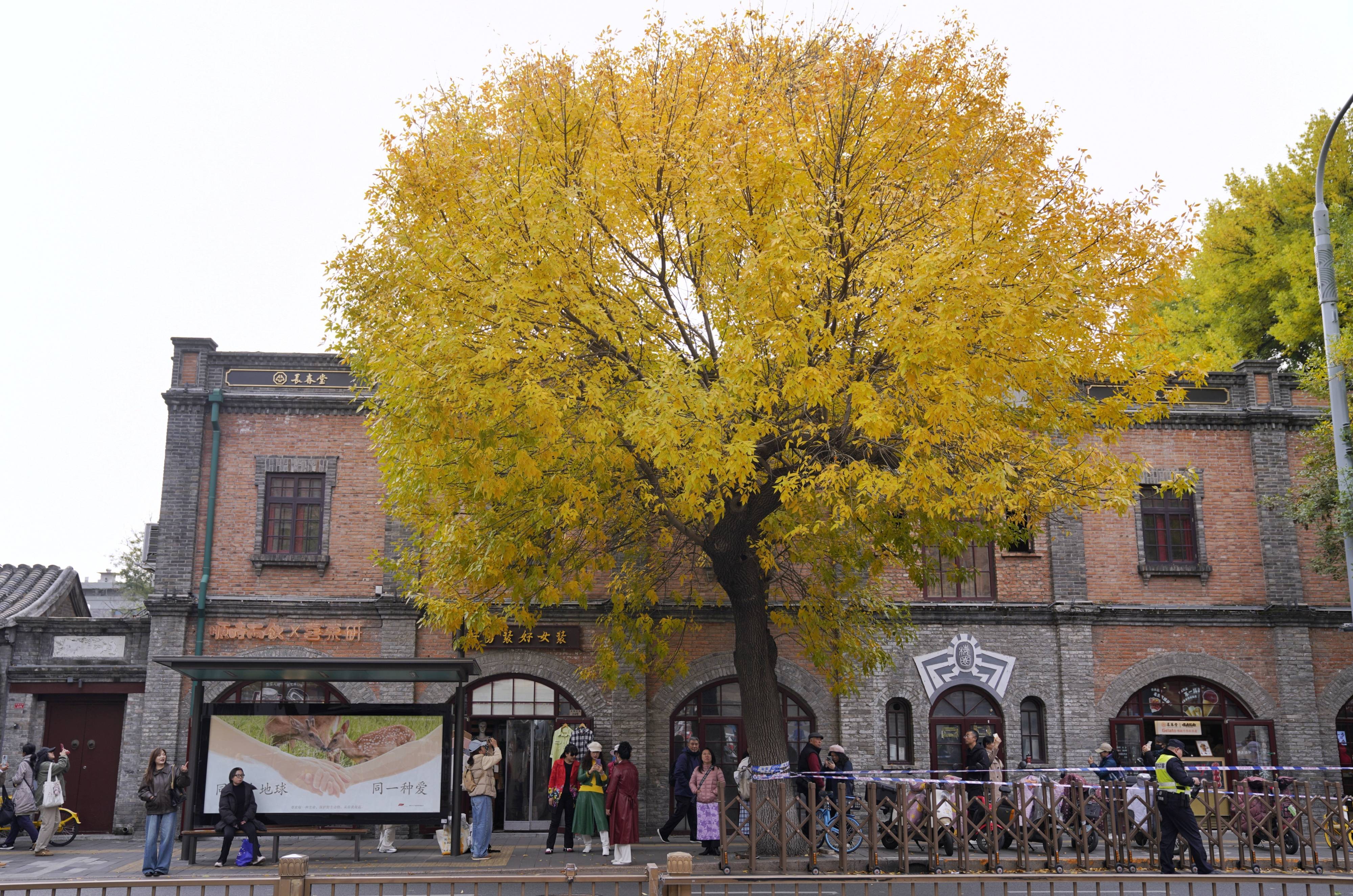 网红白蜡树的北侧,是著名的北大红楼,金黄的树叶与北大红楼的红色外墙,形成鲜明色彩对比,营造出温暖而富有历史感的画面,这里是网友们推荐的拍摄白蜡的最佳位置。长短镜头、CCD相机、手机,游客们带着全套拍摄装备齐上阵,随着傍晚来临,夕阳铺满五四大街,余晖将街道两旁正在变黄的白蜡树镶上金边。