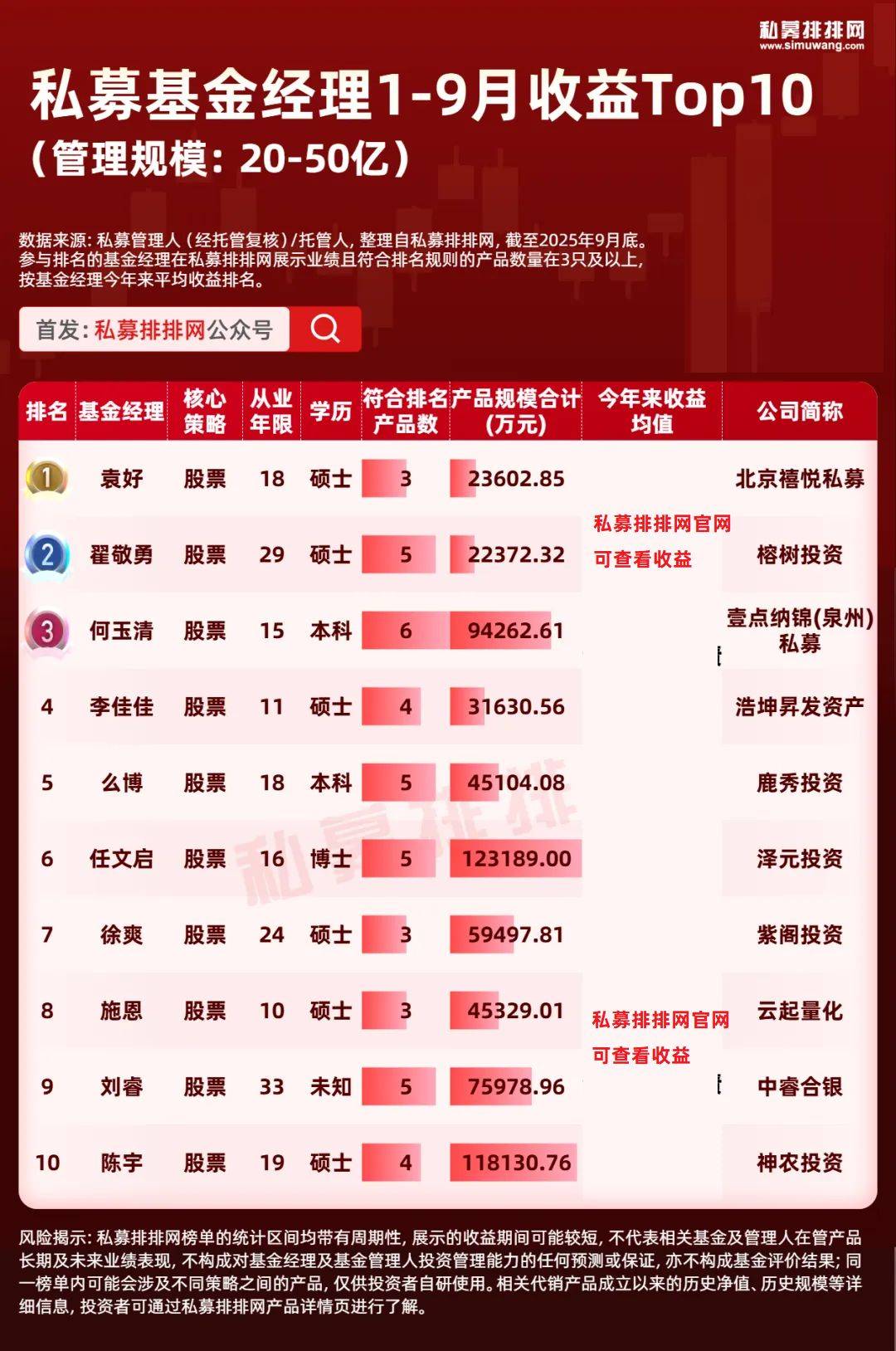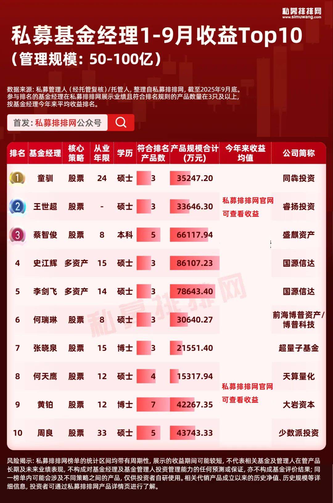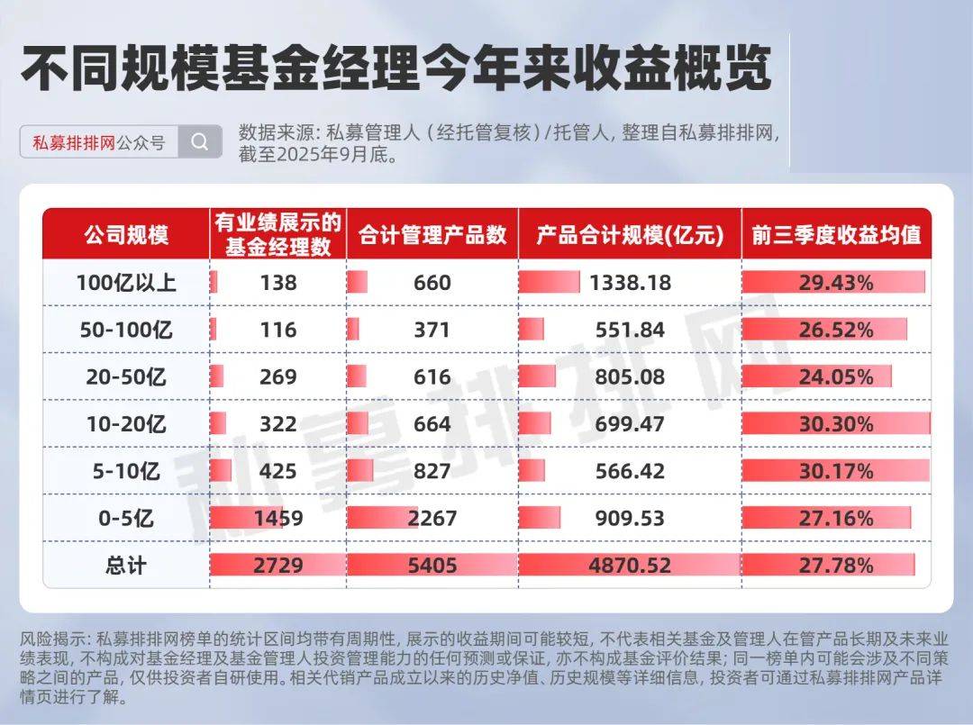 截至2025年9月底,来自50-100亿私募且“在私募排排网有3只及以上的私募产品有业绩展示”的基金经理共有48位。