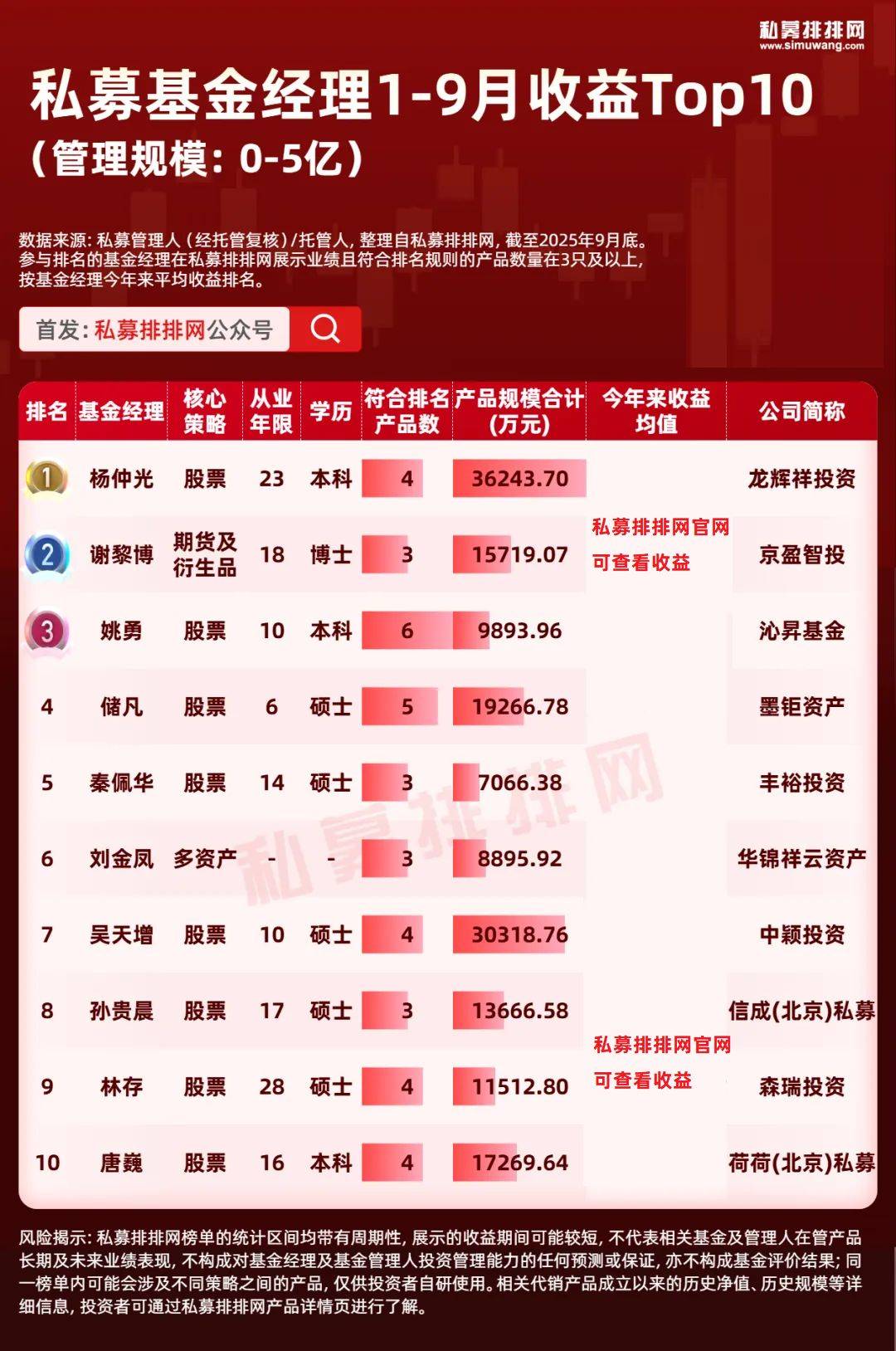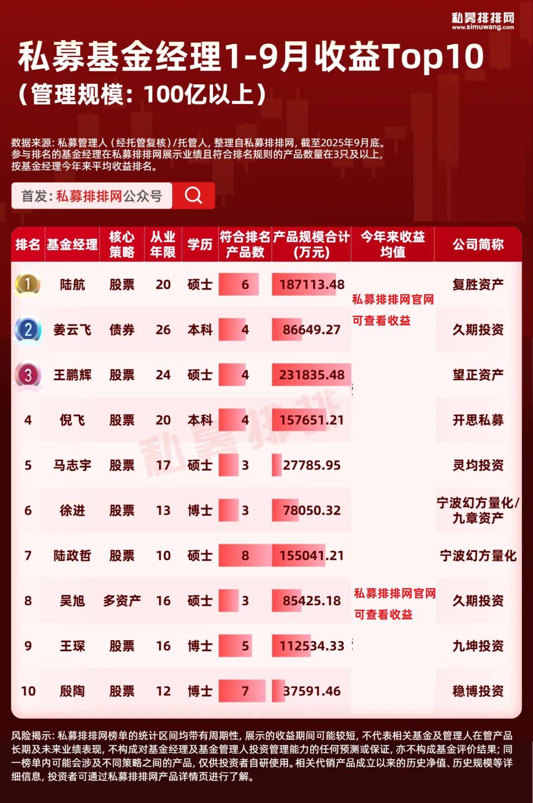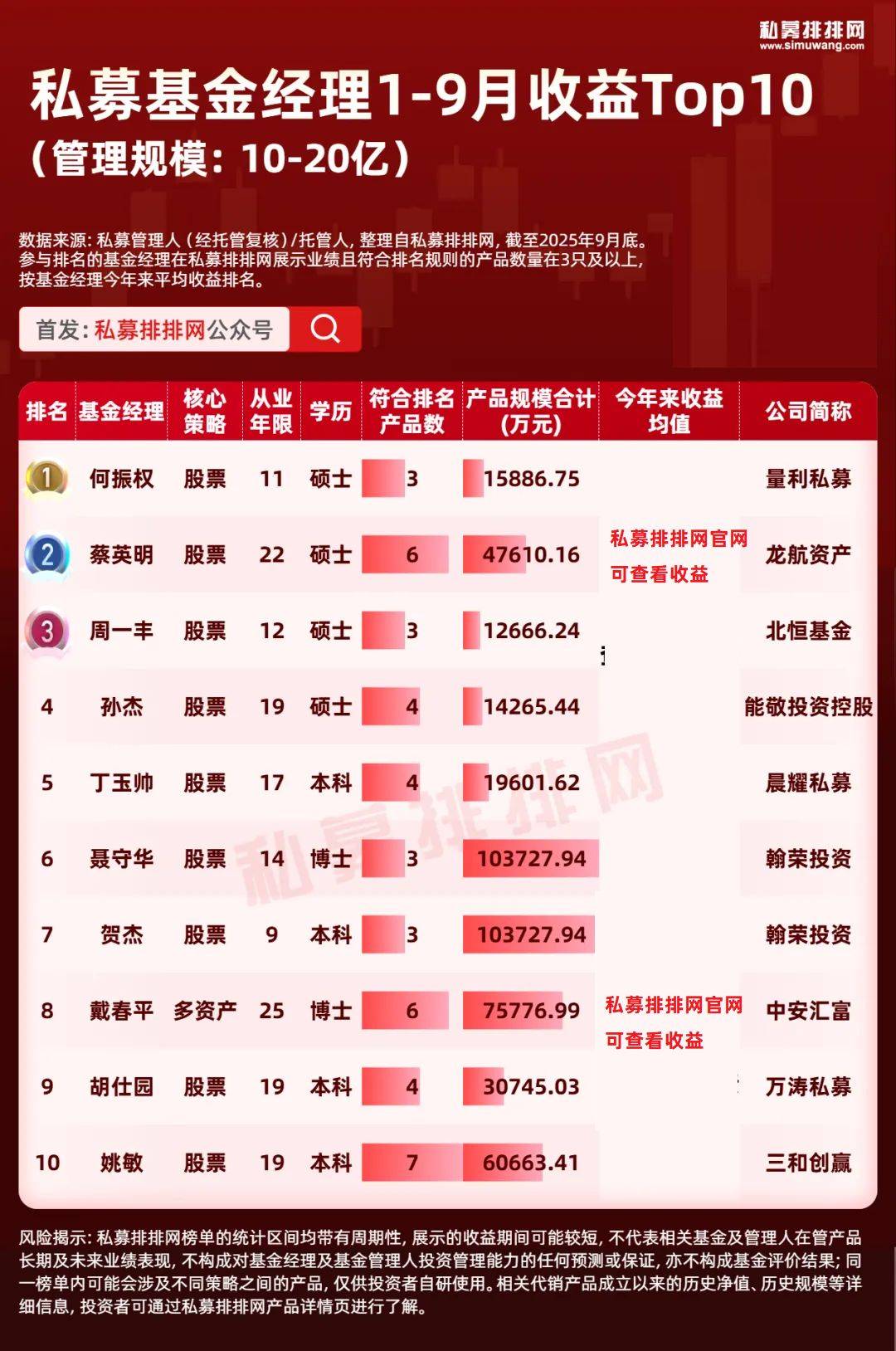 截至2025年9月底,来自50-100亿私募且“在私募排排网有3只及以上的私募产品有业绩展示”的基金经理共有48位。