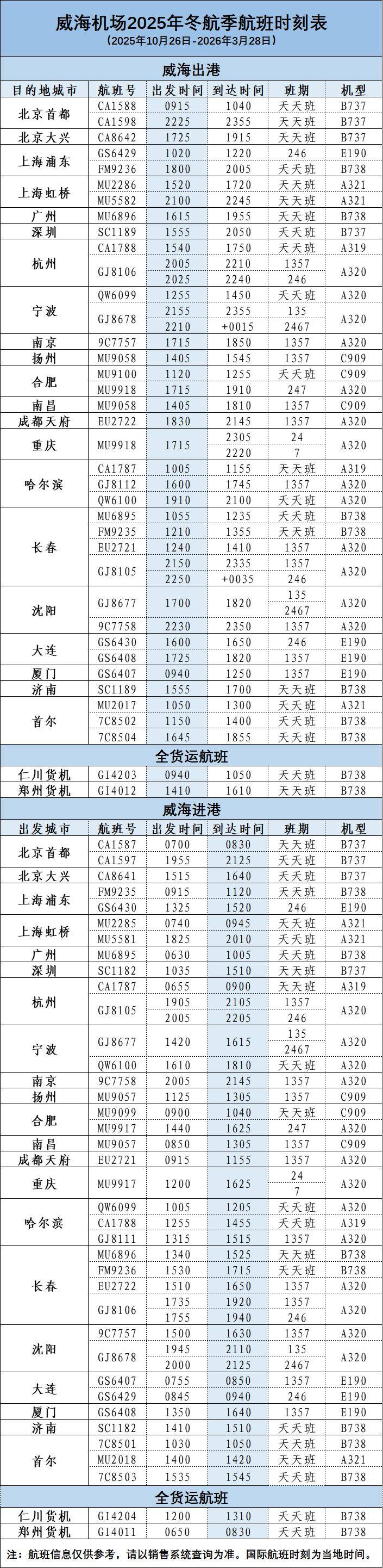 10月26日起,威海机场将执行冬春季航班计划。