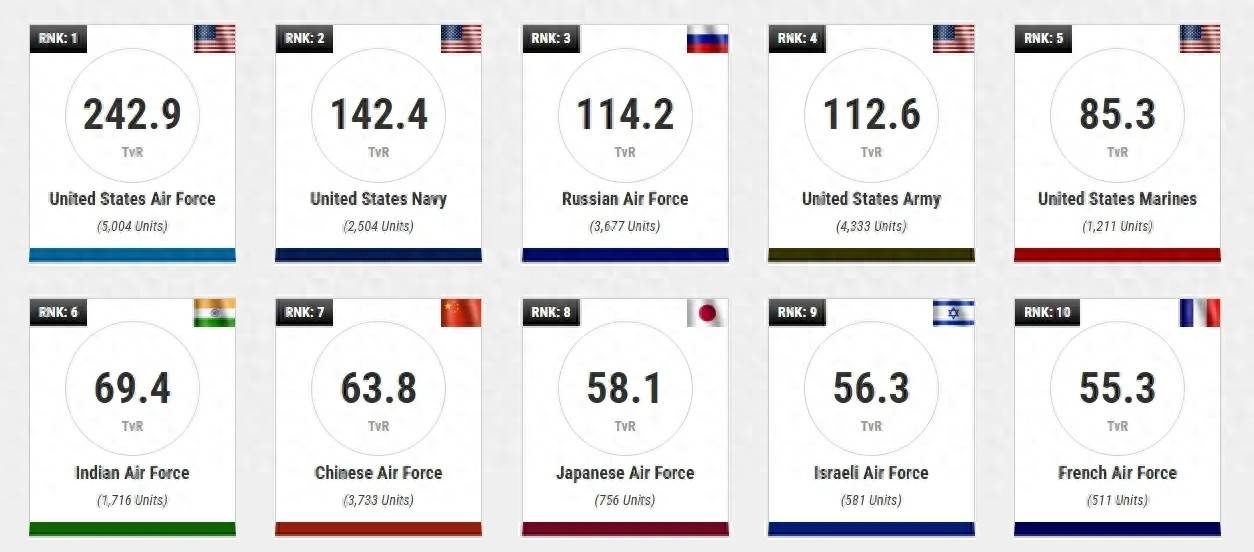 美国给自己的空军评分高达242.9分,而中国空军仅获得63.8分,印度甚至比中国高出5.6分。按照这个标准,美国空军的实力遥不可及,远超俄罗斯、印度和中国加起来的总和。