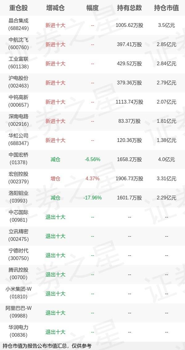 证券之星消息,10月27日银华基金旗下李晓星 张腾 杜宇管理的银华心佳两年持有期混合型基金公布三季报,近1年净值增长率46.87%。与上一季度相比,该基金前十大重仓股新增晶合集成,中航沈飞,工业富联,沪电股份,中钨高新,深南电路,华虹公司;其中中国宏桥持仓占比5.96%,为该基金第一大重仓股;中芯国际,立讯精密,宁德时代,腾讯控股,小米集团-W,阿里巴巴-W,华润电力等退出前十大重仓股;详细数据如下: