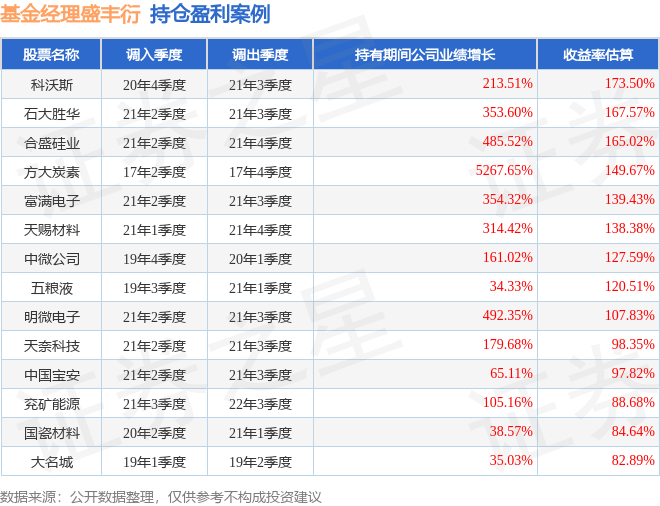 盛丰衍管理的500增强LOF基金在20年4季度买入科沃斯,在持有3个季度后在21年3季度卖出。持有期间的估算收益率为173.5%,持有期间科沃斯在2020年到2021年的年报归属净利润增幅达213.51%。