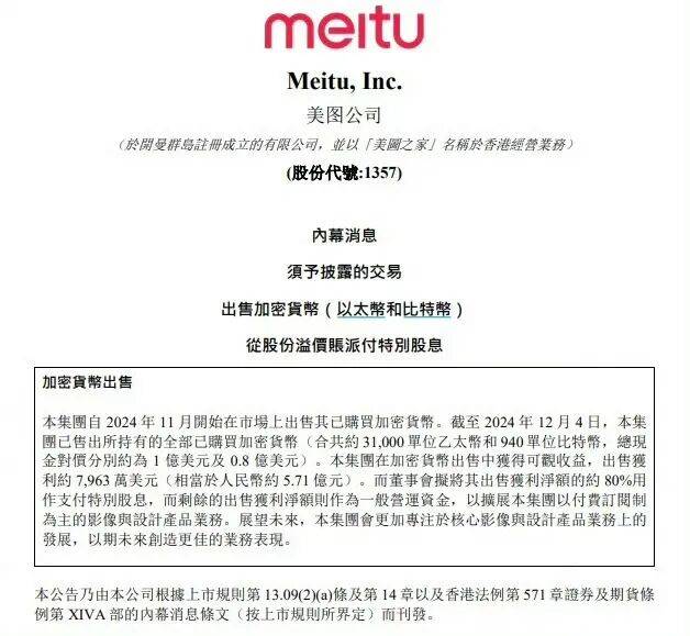 相比于持续囤积比特币的博雅互动,美图秀秀母公司美图已经完成了套现离场,美图从2021年开始买入比特币和以太币,2024年比特币涨到10万美元,美图选择落袋为安。年底美图公告称已经出售所持有的全部加密货币,总现金对价约为1.8亿美元,盈利约为7963万美元(约为人民币5.71亿元),同时美图表示拟将出售获利约80%用作支付特别股息。