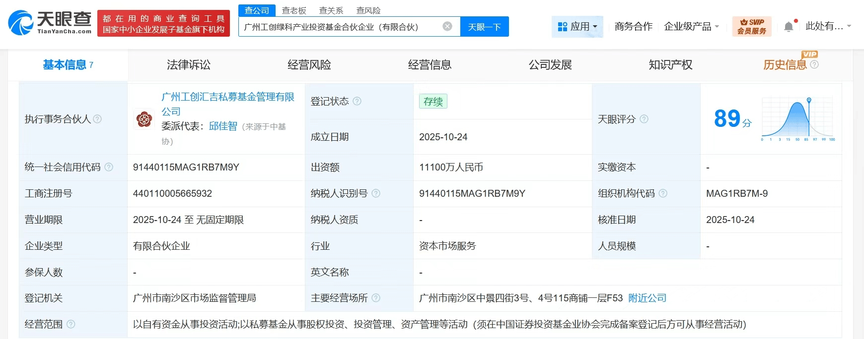 松果财经讯,天眼查工商信息显示,近日,广州工创绿科产业投资基金合伙企业(有限合伙)成立,执行事务合伙人为广州工创汇吉私募基金管理有限公司,出资额1.11亿人民币,经营范围为以自有资金从事投资活动,以私募基金从事股权投资、投资管理、资产管理等活动。合伙人信息显示,该基金由派诺科技(920375)、济南西城投资发展有限公司、广州工控混改股权投资基金合伙企业(有限合伙)等共同出资。