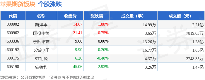 证券之星消息,10月27日苹果期货板块较上一交易日下跌0.08%,安德利领跌。当日上证指数报收于3996.94,上涨1.18%。深证成指报收于13489.4,上涨1.51%。苹果期货板块个股涨跌见下表: