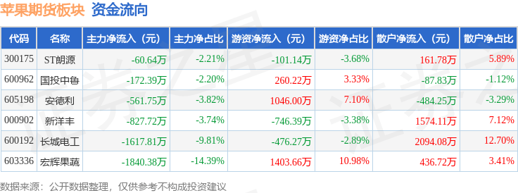 从资金流向上来看,当日苹果期货板块主力资金净流出5080.69万元,游资资金净流入1386.08万元,散户资金净流入3694.61万元。苹果期货板块个股资金流向见下表: