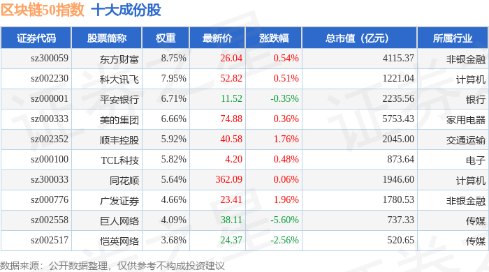 区块链50(399286)指数十大成份股详情如下:
