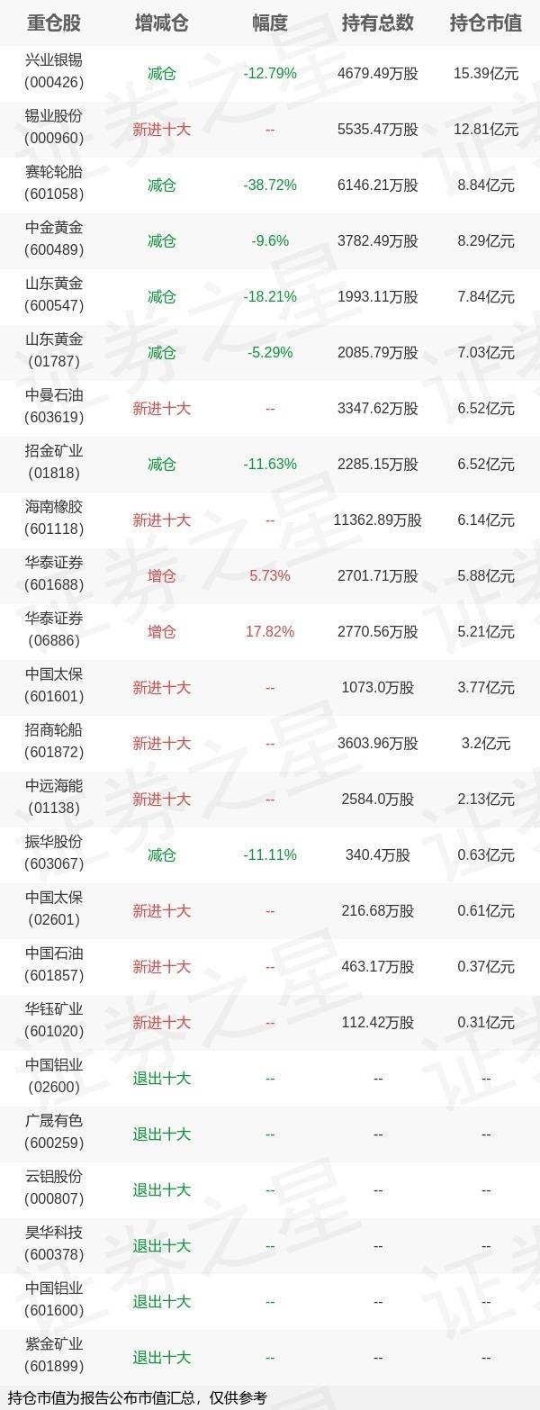 证券之星消息,10月28日大成基金韩创旗下基金公布2025年三季报,综合其旗下各基金报告,港股持仓比重大幅增加,华泰证券等被增持,中远海能、中国太保等新入十大重仓;另外,有色金属行业板块个股更受其关注,与上季度相比,锡业股份、华钰矿业等新入十大重仓;目前其旗下基金综合持仓排名前三个股为兴业银锡、锡业股份、赛轮轮胎。