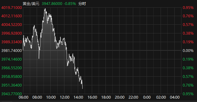 据Choice数据,10月28日,国际现货黄金早盘冲高回落,午后震荡走低,盘中跌破3950美元/盎司关口,截至14:39报3947.86美元/盎司,日内跌近1%。