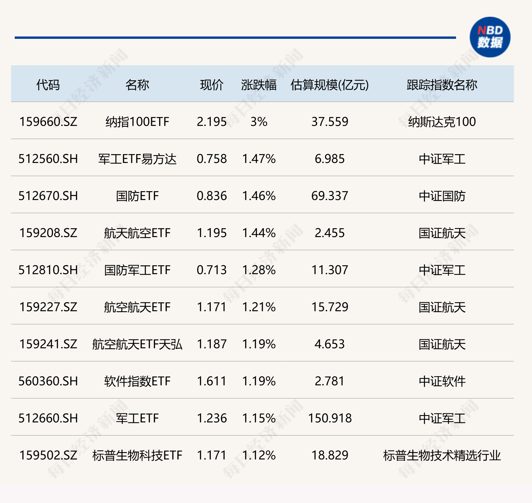 ETF涨跌幅方面,纳指100ETF上涨3%。