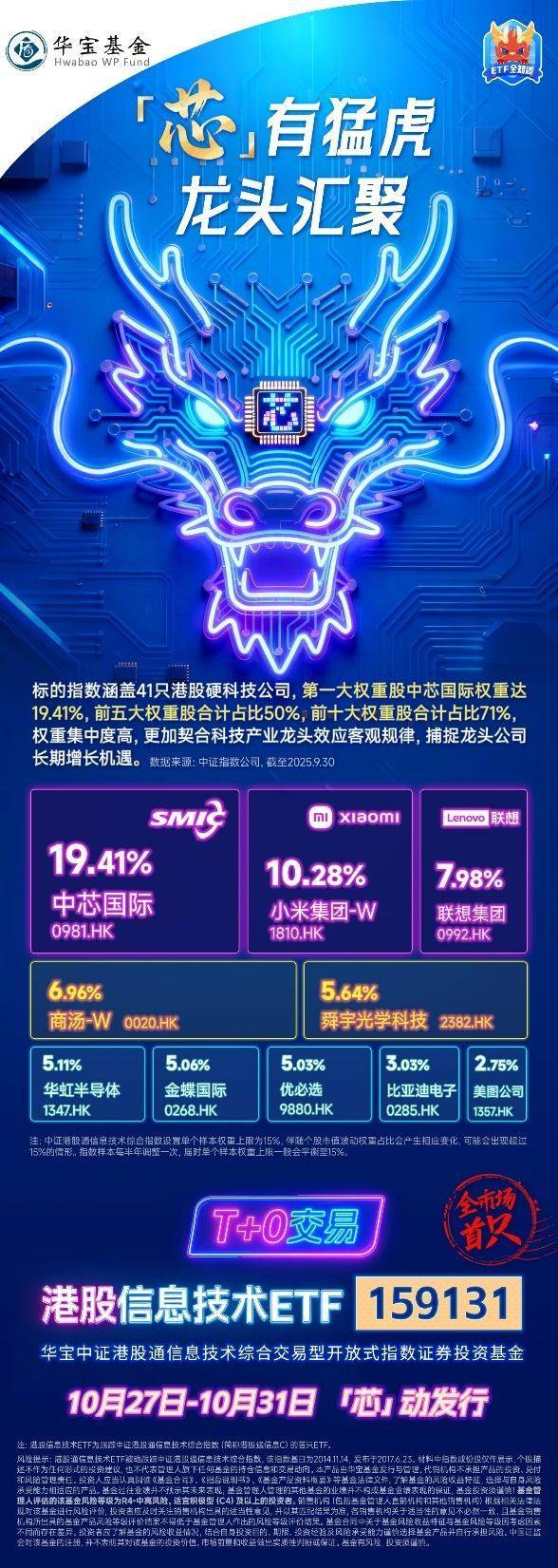 千亿规模ETF大厂——华宝基金10.27-10.31热力启动全市场首只港股信息技术ETF(159131)全网发售,该基金为全市场首只跟踪中证港股通信息技术综合指数(简称“港股通信息C”)的ETF,其标的指数由属于信息技术产业的41只港股硬科技公司构成成份股组合,将为投资者参与把握港股“中国硬科技资产”投资机遇提供首选创新ETF工具。
