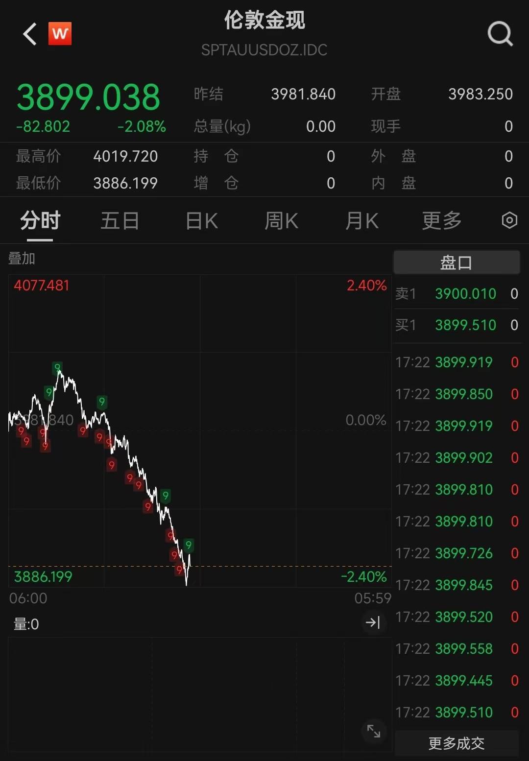 10月28日,现货黄金再度走低,跌破3900美元/盎司,日内跌超2%,两日来连续失守4000、3900美元两道整数关口。截至北京时间17:22,伦敦金现报3899美元/盎司。
