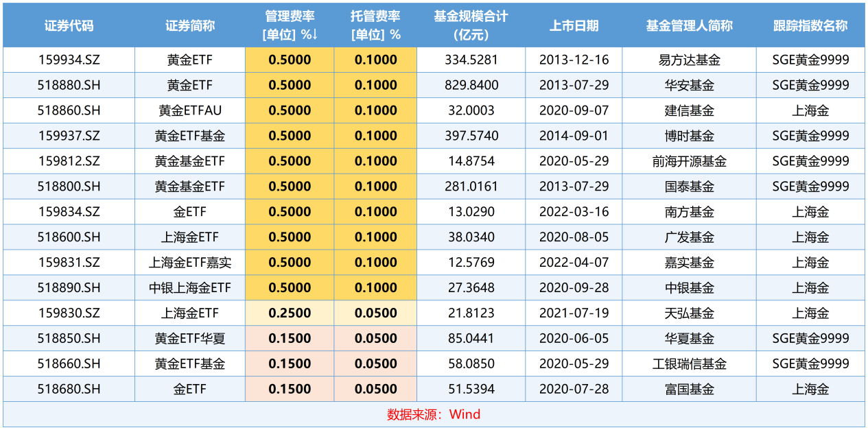 不同黄金ETF管理费、托管费对比