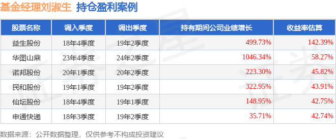 刘淑生管理的汇丰晋信2026周期混合基金在18年4季度买入益生股份,在持有2个季度后在19年2季度卖出。持有期间的估算收益率为142.39%,持有期间益生股份在2018年到2019年的年报归属净利润增幅达499.73%。