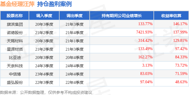 汪萍管理的圆信永丰大湾区A基金在20年3季度买入旗滨集团,在持有1年又0个季度后在21年3季度卖出。持有期间的估算收益率为146.17%,持有期间旗滨集团在2020年到2021年的年报归属净利润增幅达133.77%。