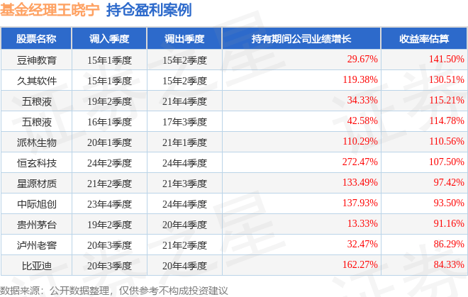 王晓宁管理的国富健康优质生活股票基金在15年1季度买入豆神教育,在持有1个季度后在15年2季度卖出。持有期间的估算收益率为141.5%,持有期间豆神教育在2014年到2015年的年报归属净利润增幅达29.67%。