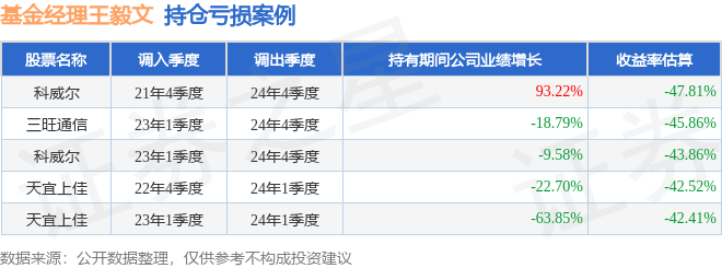 王毅文管理的华商策略精选混合基金在21年4季度买入科威尔,在持有3年又0个季度后在24年4季度卖出。持有期间的估算收益率为-47.81%,持有期间科威尔在2021年到2024年的年报营业总收入增幅达93.22%。