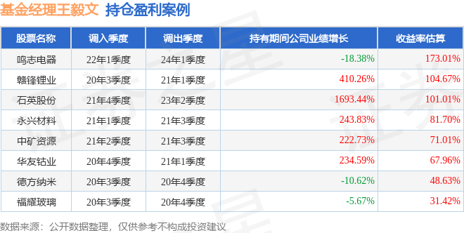 王毅文管理的华商策略精选混合基金在21年1季度买入永兴材料,在持有2个季度后在21年3季度卖出。持有期间的估算收益率为81.7%,持有期间永兴材料在2020年到2021年的年报归属净利润增幅达243.83%。