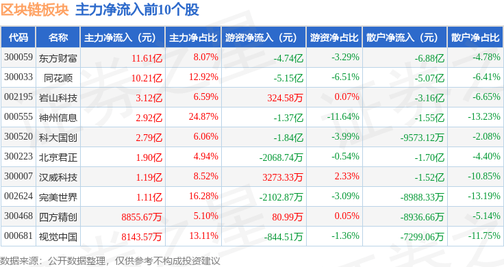 从资金流向上来看,当日区块链板块主力资金净流出23.67亿元,游资资金净流入3.18亿元,散户资金净流入20.49亿元。区块链板块个股资金流向见下表: