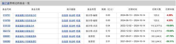 更具讽刺意味的是2024年6月接手的海富通数字经济混合基金,杨宁嘉仅管理100多天便仓促卸任,而这只基金成立于2024年6月13日,成立不足一年,就在2025年5月宣告清盘。