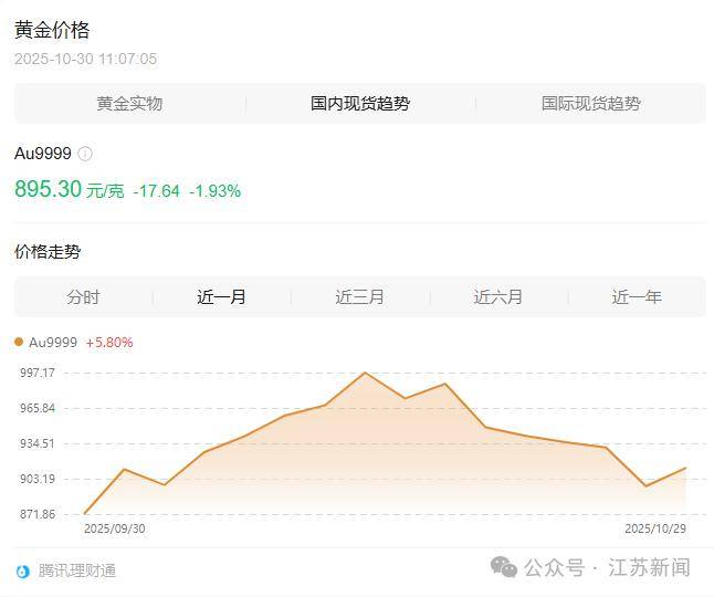 10月30日,国内现货黄金报价895.30元/克,跌1.93%,跌破900元/克关口。