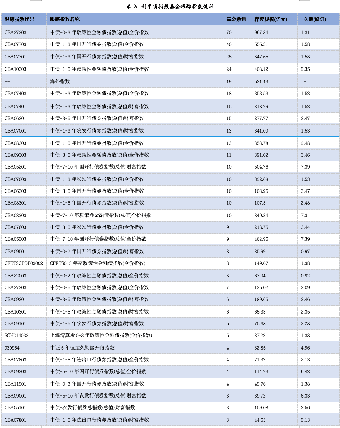 债券指数基金的跟踪标的有中债指数、中证指数、上清所指数、海外指数及交易所指数。可以看出,大多数产品跟踪的还是中债指数。其中CBA27203的跟踪产品为70只(含A/C类),存续规模将近1000亿元。除此之外,跟踪指数采用海外指数的有19只,总规模为531亿元,多为彭博公布的中国指数。下表是主要的跟踪标的、存续规模及指数的久期: