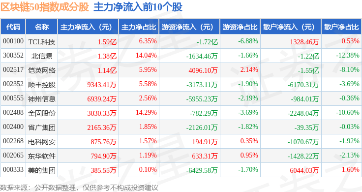 资金流向方面,区块链50(399286)指数成份股当日主力资金净流出合计63.45亿元,游资资金净流入合计18.42亿元,散户资金净流入合计45.03亿元。成份股资金流向详情见下表: