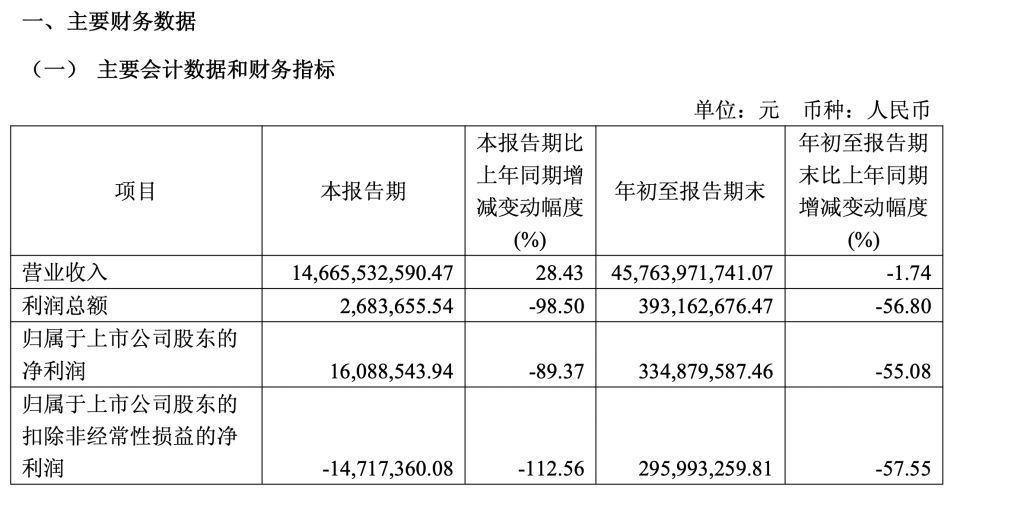 10月30日,中国黄金集团黄金珠宝股份有限公司(中国黄金,600916)发布三季度报,第三季度营业收入146.66亿元,同比增长28.43%;归属于上市公司股东的净利润1608.85万元,同比下降89.37%。