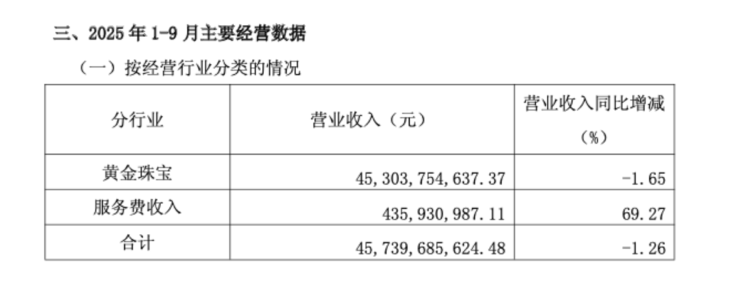 中国黄金披露的2025年1至9月主要经营数据公告显示,该公司前三季度黄金珠宝业务营收453.0亿元,同比下降1.65%;服务费收入4.36亿元,同比增长69.27%。