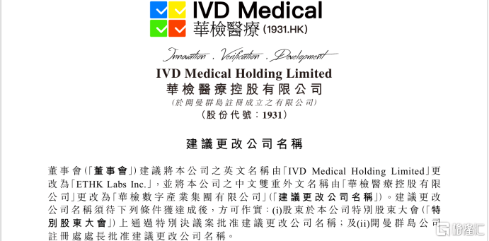 9月14日,华检医疗(01931.HK)发布公告,宣布与ETHK Group共同投资设立两家合资公司——ETHK Inc与ETHK HOLDINGS LIMITED。与此同时,公司正式启动品牌焕新,英文名称由「IVD Medical Holding Limited」更改为「ETHK Labs Inc.」,中文名称更新为「华检数字产业集团有限公司」。