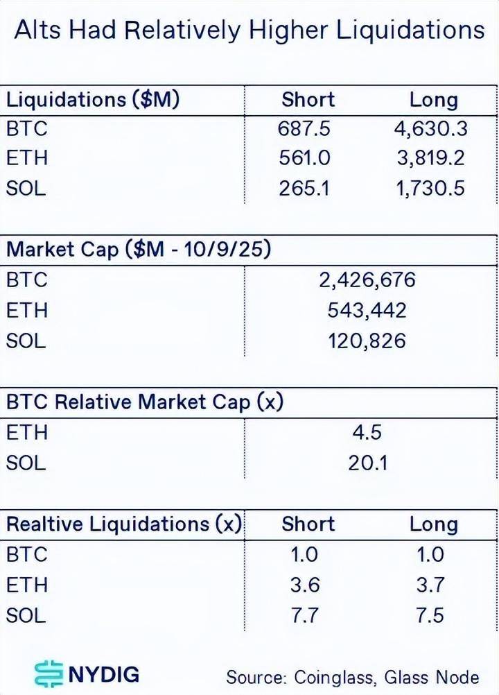 值得注意的是,ETH 和 SOL 的体量远小于 BTC。在暴跌之前,BTC 的市值约为 ETH 的 4.5 倍、SOL 的 20 倍。按体量调整后,ETH 的相对清算规模约为 BTC 的 3.7 倍,SOL 约为 BTC 的 7.6 倍。