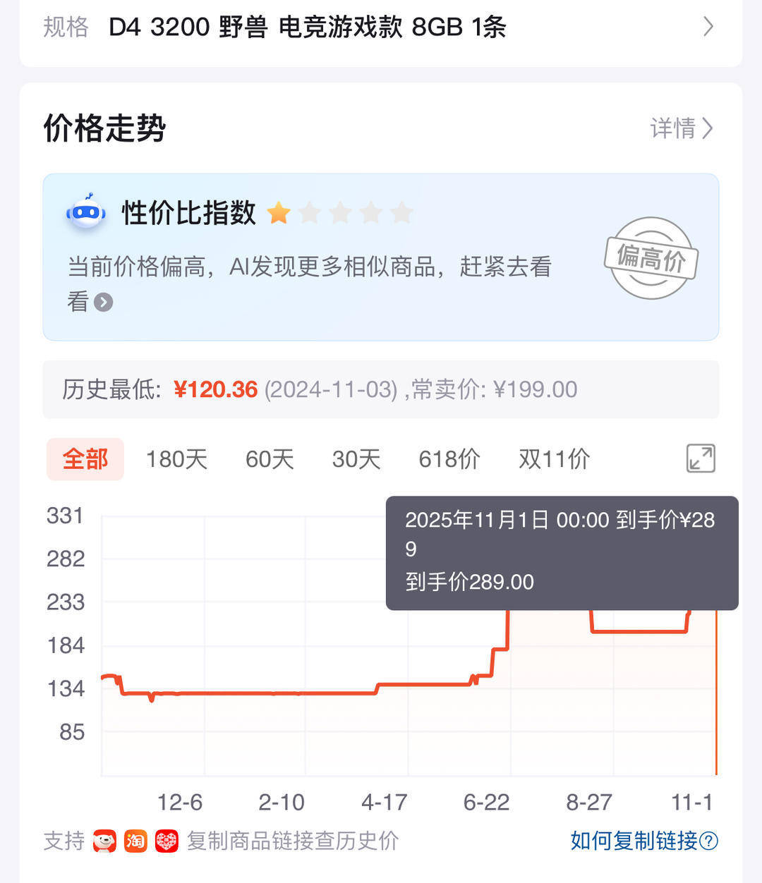 “配件都买齐了,就剩内存条没买,结果一看价格和上个月比直接翻倍。”原本计划趁着“双十一”组装电脑的张宇,最终因内存条价格却步了。近期,内存价格大幅上涨成为社交媒体上的热议话题,不少消费者反映,组装整机的成本甚至上涨超过千元,因此有人选择观望也有人选择“平替”。