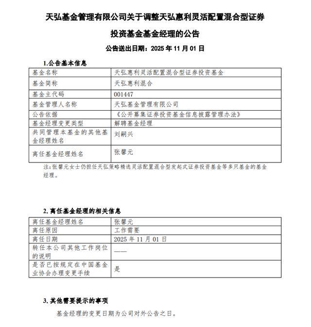 11月1日,天弘惠利混合公告称,调整天弘惠利灵活配置混合型证券投资基金基金经理,原基金经理张馨元因工作需要不再管理天弘惠利混合,共同管理基金经理刘嗣兴继续管理该基金。变更日期为2025年11月1日。
