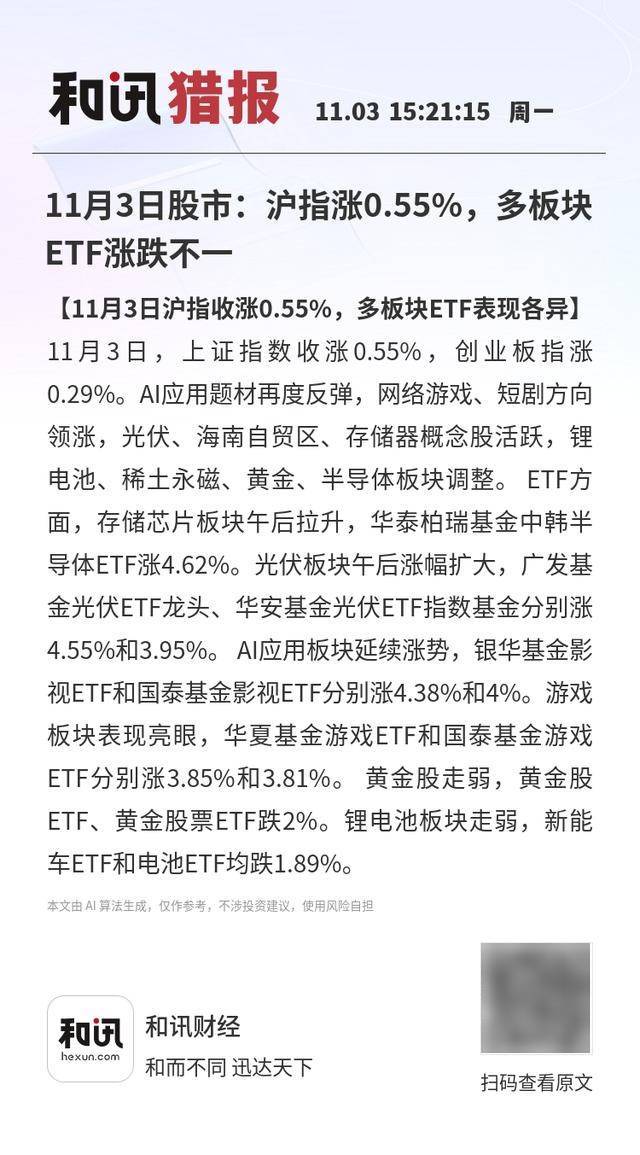 【11月3日沪指收涨0.55%,多板块ETF表现各异】11月3日,上证指数收涨0.55%,创业板指涨0.29%。AI应用题材再度反弹,网络游戏、短剧方向领涨,光伏、海南自贸区、存储器概念股活跃,锂电池、稀土永磁、黄金、半导体板块调整。ETF方面,存储芯片板块午后拉升,华泰柏瑞基金中韩半导体ETF涨4.62%。光伏板块午后涨幅扩大,广发基金光伏ETF龙头、华安基金光伏ETF指数基金分别涨4.55%和3.95%。AI应用板块延续涨势,银华基金影视ETF和国泰基金影视ETF分别涨4.38%和4%。游戏板块表现亮眼,华夏基金游戏ETF和国泰基金游戏ETF分别涨3.85%和3.81%。黄金股走弱,黄金股ETF、黄金股票ETF跌2%。锂电池板块走弱,新能车ETF和电池ETF均跌1.89%。