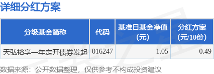 证券之星消息,11月4日发布《天弘裕享一年定期开放债券型发起式证券投资基金分红公告》。本次分红为2025年度的第1次分红。公告显示,本次分红的收益分配基准日为10月10日,详细分红方案如下: