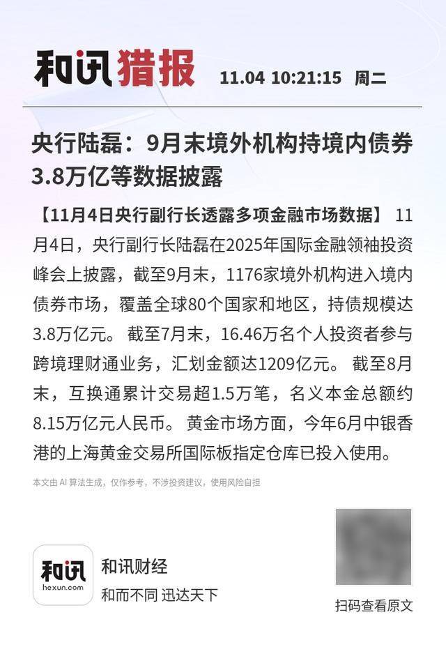 【11月4日央行副行长透露多项金融市场数据】11月4日,央行副行长陆磊在2025年国际金融领袖投资峰会上披露,截至9月末,1176家境外机构进入境内债券市场,覆盖全球80个国家和地区,持债规模达3.8万亿元。 截至7月末,16.46万名个人投资者参与跨境理财通业务,汇划金额达1209亿元。 截至8月末,互换通累计交易超1.5万笔,名义本金总额约8.15万亿元人民币。 黄金市场方面,今年6月中银香港的上海黄金交易所国际板指定仓库已投入使用。