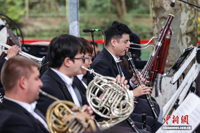 11月4日,贵阳交响乐团在贵州省贵阳市花溪区花溪河畔的“黄金大道”举行交响音乐会,演奏及演唱了多首耳熟能详的经典曲目,为现场观众带来一场户外视听盛宴。图为指挥家张国勇执棒贵阳交响乐团。中新社记者 瞿宏伦 摄