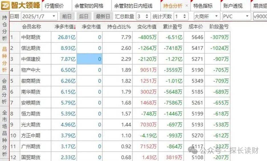 截至2025年1月初,中财期货仍然位居PVC多头持仓第一,持仓规模达26.81亿元,第三方平台显示其亏损额达6.5亿元。