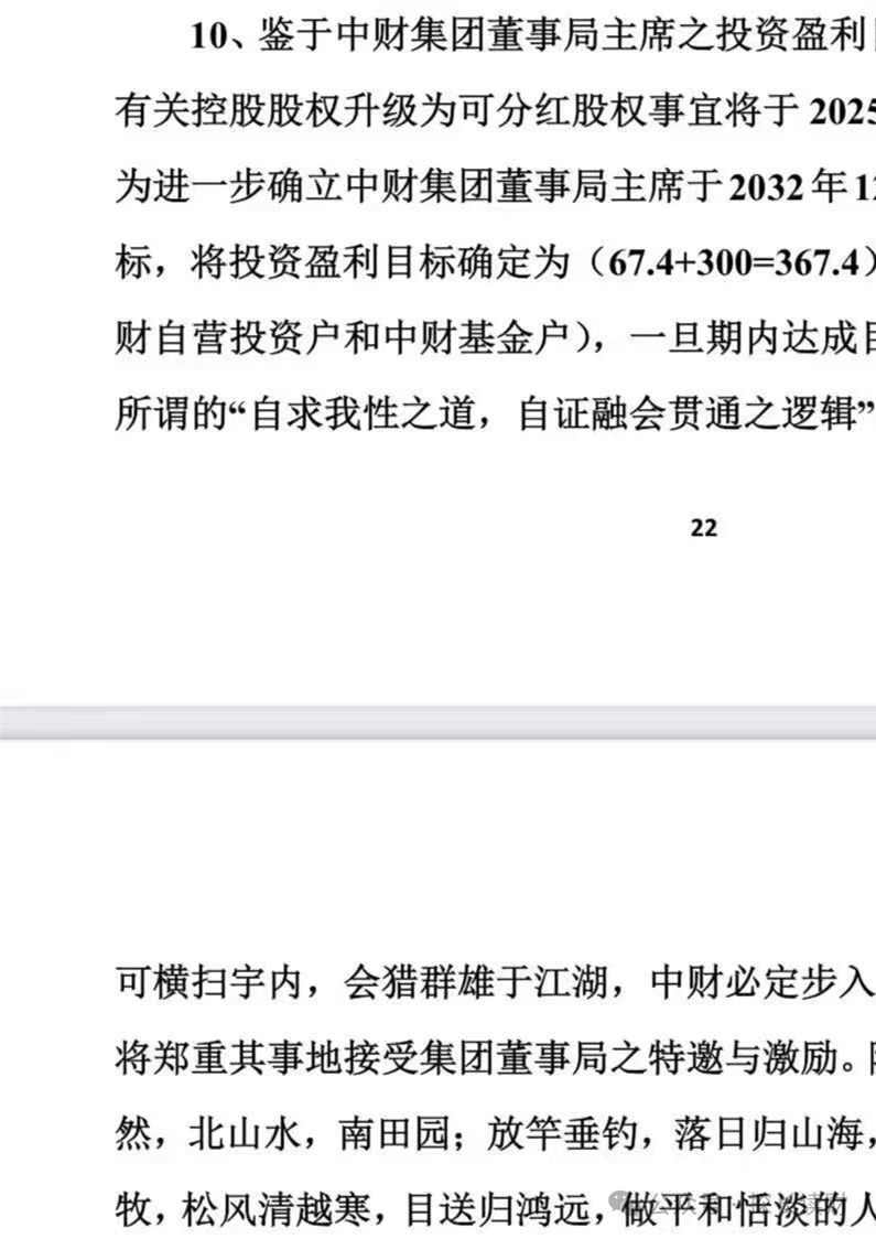 近日,社交媒体上流传出一张疑似中财集团董事局主席边锡明给投资人的内部信截图,信件显示,中财集团董事局主席(边锡明)投资盈利目标已经提前达到,因此将控股股权升级为可分红股权事宜将在2025年初按约定执行。此外,边锡明决定将2032年12月之前的投资盈利目标定为67.4+300=367.4亿元人民币(包括中财自营投资户和中财基金户),