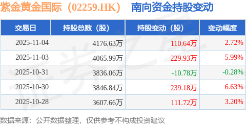 证券之星消息,11月4日南向资金增持110.64万股紫金黄金国际(02259.HK)。近5个交易日中,获南向资金增持的有4天,累计净增持680.69万股。截至目前,南向资金持有紫金黄金国际(02259.HK)4176.63万股,占公司已发行普通股的1.56%。
